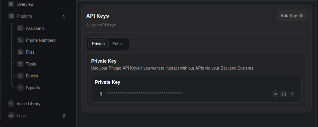 SendContextToProtegee and GetContextFromProtegee tools in order to let your agent interact with Protegee. Don’t worry, all this requires from you is to press a button.You’ll want to grab your VAPI private api key. It will look like: